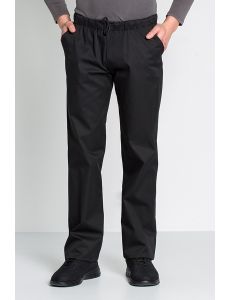 Pantalón negro de caballero para hostelería. Tiene 2 bolsillos pasamanos y un bolsillo lateral sobrepuesto con velcro. Cintura con goma en la parte trasera y trinchas con ojales para pasar la cinta aj ustable. Pespuntes en rodillas.