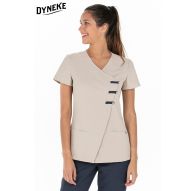 Chaqueta de mujer para estética, spa y comercio en manga corta. Tejido beige rico en algodón con detalle franjas raso beige en diagonal a la altura de la cintura. Se abrocha con cremallera de malla invertida, para evitar el deterioro por rozamiento. Dispone de dos bolsillos inferiores y aberturas laterales. ¡Personalizarla! bordamos tu nombre o logo.
