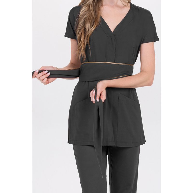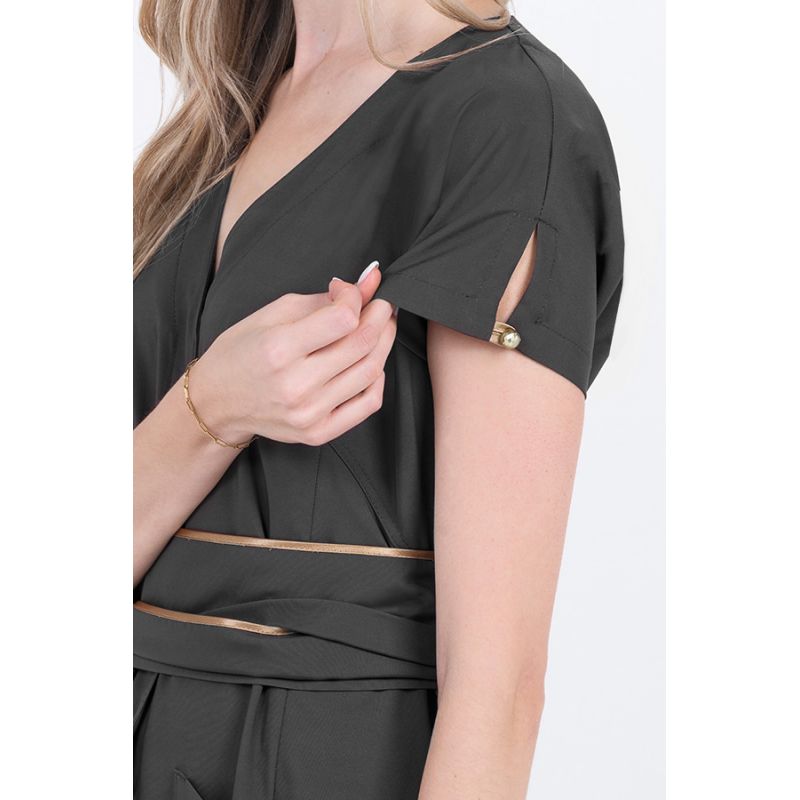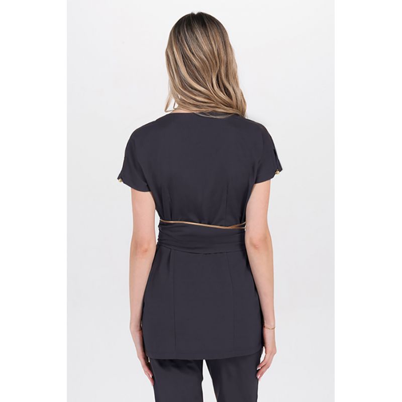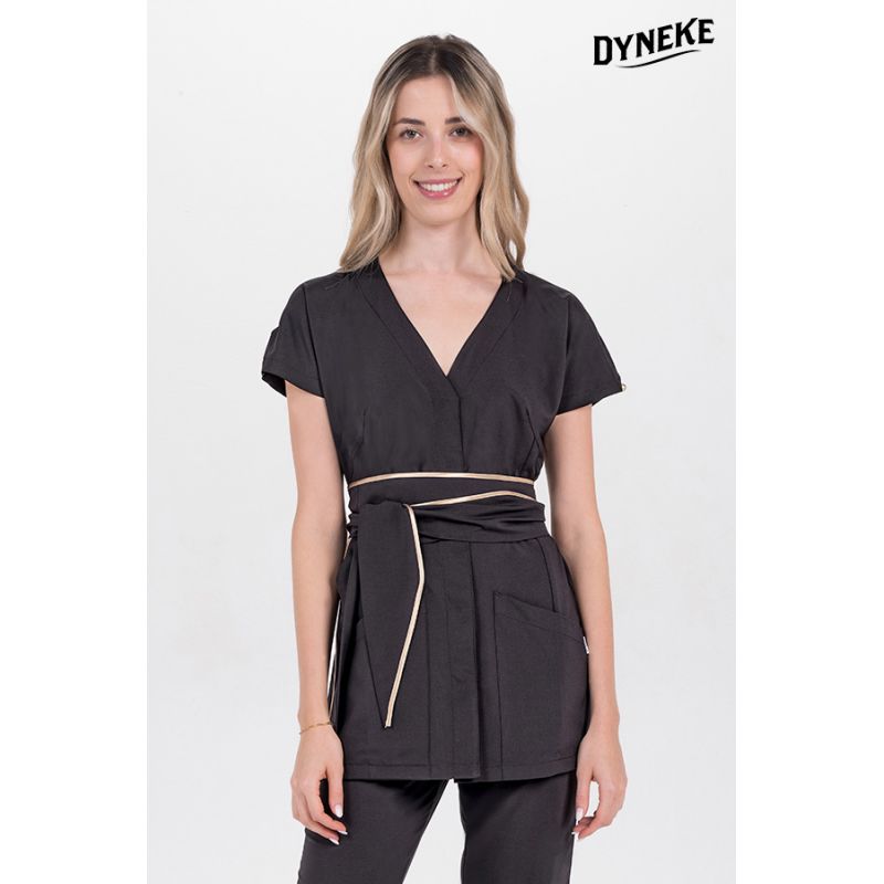 Kimono marrón con cinturón para comercio, estética y spa manga corta, detalle botón y raso dorado. Cinturón marrón con vivo dorado, ideal para definir la silueta y te permite un ajuste personalizado aportando un toque elegante a la prenda.